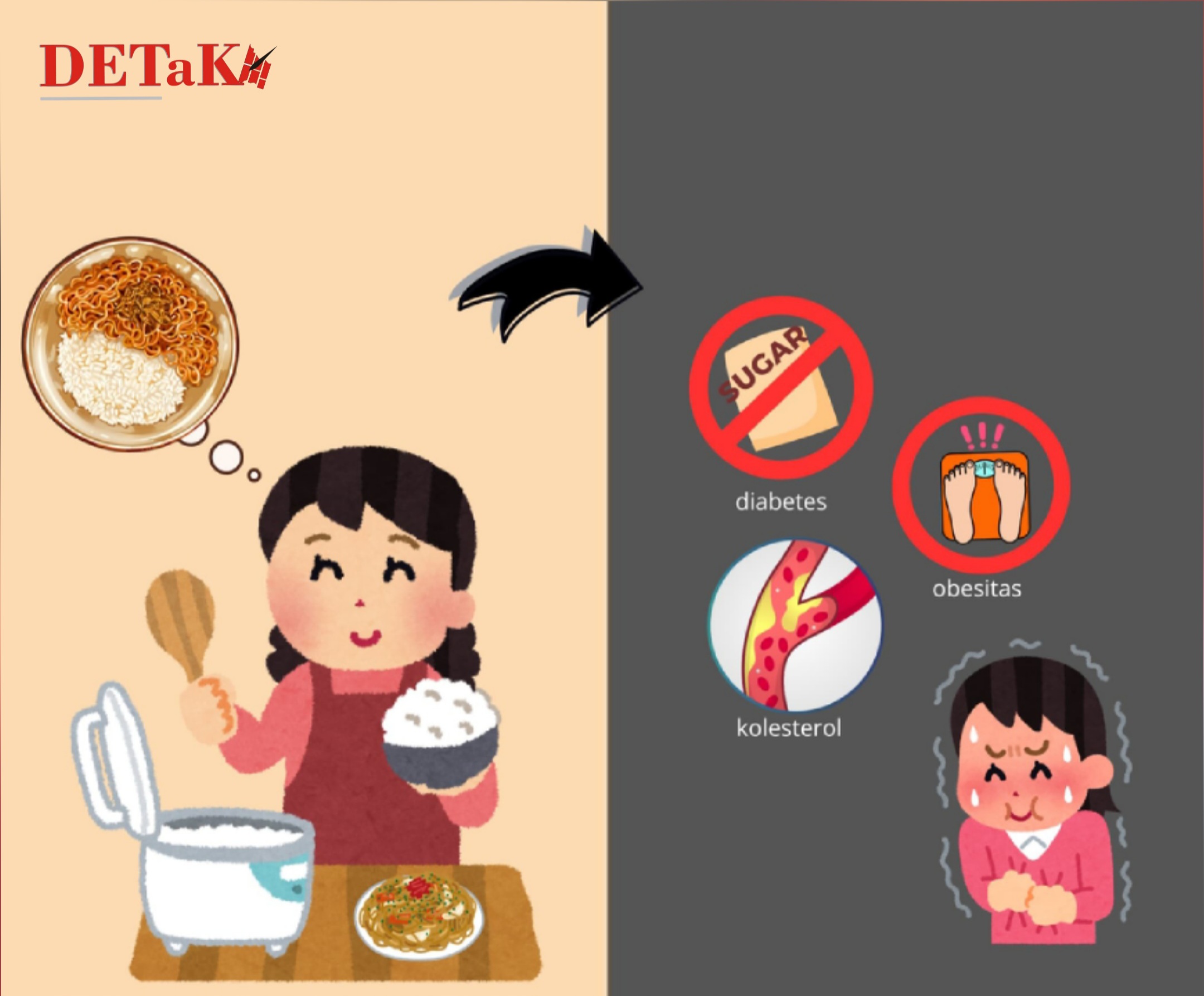 Dari sudut pandang gizi, nasi dan mi instan memiliki kesamaan utama, yakni keduanya merupakan sumber karbohidrat. Tubuh memang memerlukan karbohidrat sebagai bahan bakar utama untuk beraktivitas, tetapi ketika dua sumber karbohidrat dikonsumsi bersamaan, asupannya menjadi berlebihan. Akibatnya, tubuh menerima energi dalam jumlah besar namun tidak mendapatkan keseimbangan zat gizi lainnya seperti protein, serat, vitamin, dan mineral. Kondisi ini membuat tubuh cepat kenyang namun juga cepat lapar kembali karena tidak mendapatkan nutrisi lengkap yang dibutuhkan untuk metabolisme. Dalam jangka panjang, pola makan seperti ini bisa memicu peningkatan berat badan, penumpukan lemak, bahkan risiko obesitas dan diabetes.