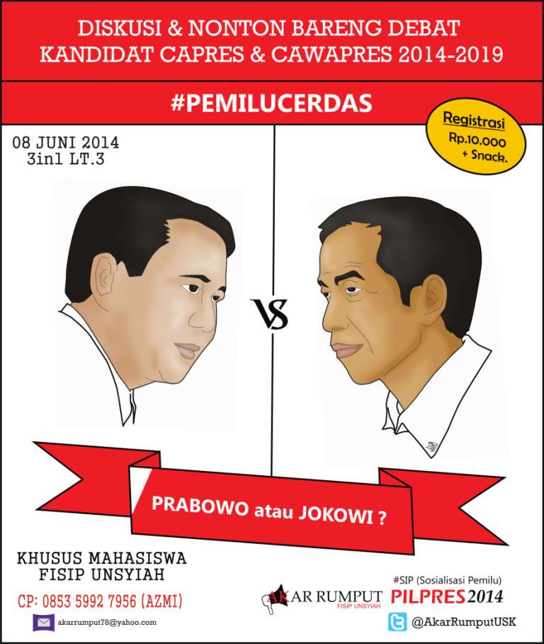 Banda Aceh – Keterlibatan masyarakat dalam tahapan Pemilu Presiden 2014 dinilai penting untuk mendewasakan pemahaman masyarakat tentang demokrasi. Untuk itu, Komunitas Akar Rumput FISIP Unsyiah, berkerja sama dengan Himpunan Mahasiswa Politik (HIMAPOL) FISIP Unsyiah, menggadakan bedah subtansi debat Calon Presiden (Capres) dan Calon Wakil Presiden (Cawapres) 2014, melalui diskusi publik yang akan dilaksanakan Senin, 9 Juni 2014, pukul 19:45 WIB di Warung Kopi 3in1, Lampineung, Banda Aceh.