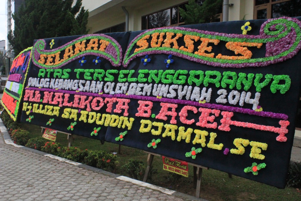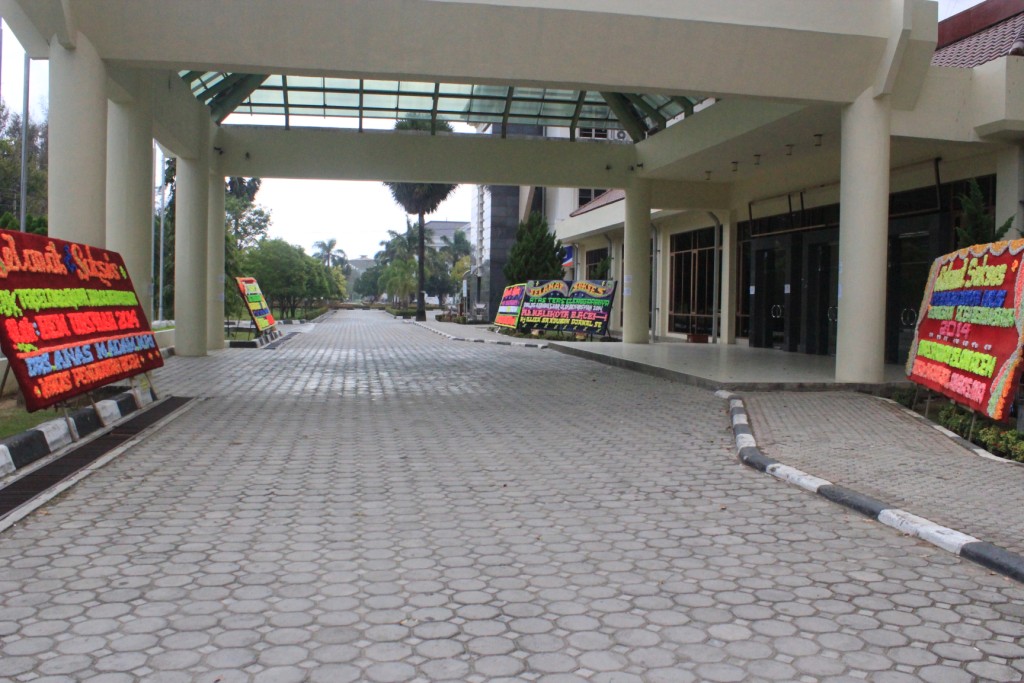 Foto 1: Suasana didepan gedung AAC lenggang. Terlihat beberapa papan bunga ucapan selamat dari Walikota Banda Aceh dan beberapa Kepala Dinas Aceh. (Tajul Ula / DETaK)