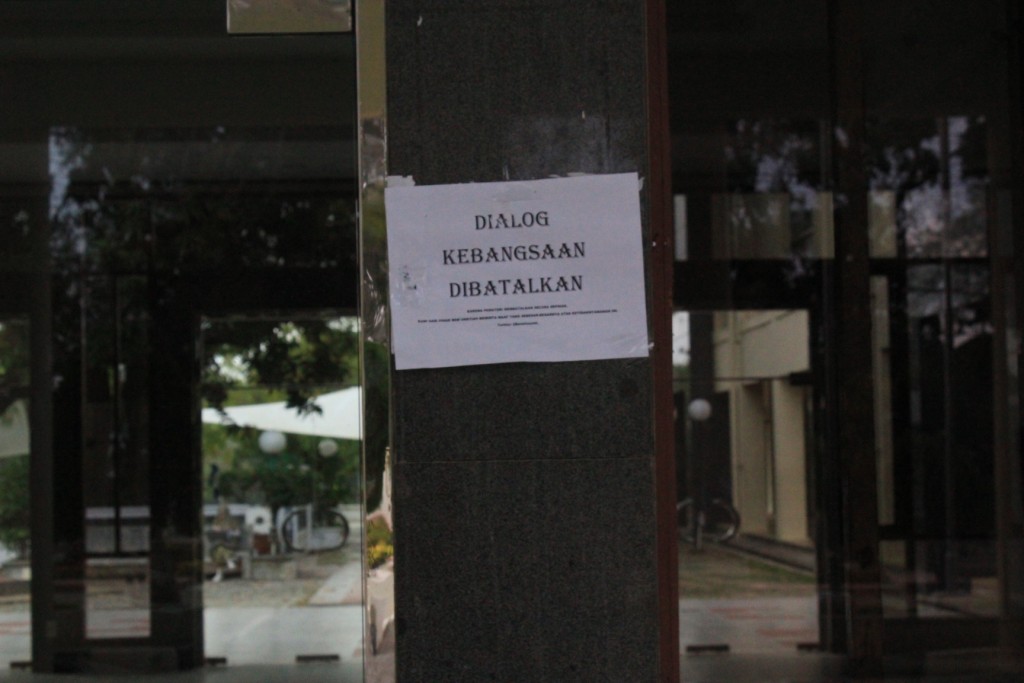 Foto 3 : Beberapa selebaran kertas yang bertuliskan “dialog kebangsaan dibatalkan” tertempel didepan pintu masuk gedung AAC. ( Tajul Ula-DETaK)
