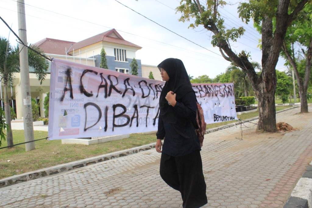 Foto 4 : Seorang wanita terlihat melewati spanduk yang bertuliskan “acara dialog kebangsaan dibatalkan” didepan gedung AAC. ( Tajul Ula-DETaK)