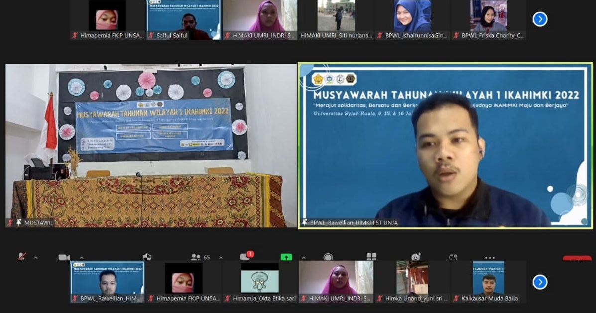 Banda Aceh – Himpunan Mahasiswa Kimia (HMK) Universitas Syiah Kuala (USK) Telah menyelenggarakan acara MUSTAWIL IKAHIMKI Wilayah 1 (Musyawarah Tahunan Wilayah Ikatan Himpunan Mahasiswa Kimia Indonesia). Kegiatan yang bertema “Merajut Solidaritas Bersatu dan Berkolaborasi demi Terwujudnya IKAHIMKI yang Maju dan Jaya” dilangsungkan pada tanggal 9, 15, dan 16 Januari 2022 melalui aplikasi Zoom Meeting.