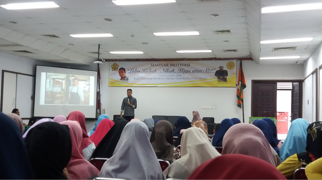 Seminar motivasi yang bertajuk “Lulus Kuliah : Nikah, Kerja, atau S2?” itu menghadirkan dua orang pemateri yaitu Feri Diansyah dan Ilham Maulana. Seminar ini bertujuan untuk memotivasi para mahasiswa yang menjelang kelulusan namun masih bingung untuk mengambil langkah selanjutnya.