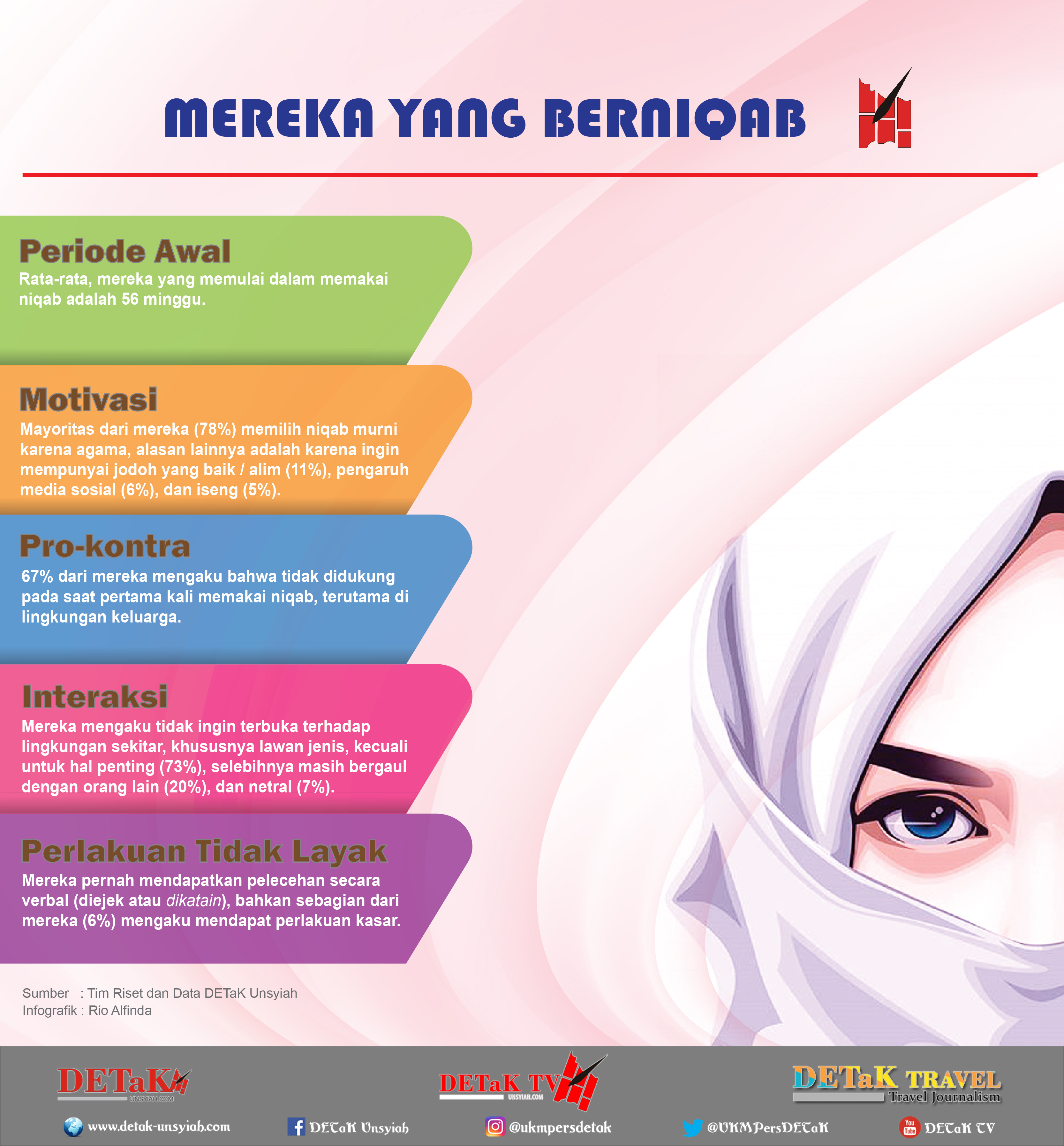 Berdasarkan latar belakang, penjelasan, dan hukum tentang niqab tersebut, detakusk.com telah melakukan sebuah riset terkait tren positif penggunaan niqab yang saat ini terjadi, khususnya di Universitas Syiah Kuala. Tim Riset dan Data DETaK memilih 15 orang mahasiswi di lingkungan Unsyiah sebagai sampel dari riset ini melalui wawancara tatap muka secara langsung.