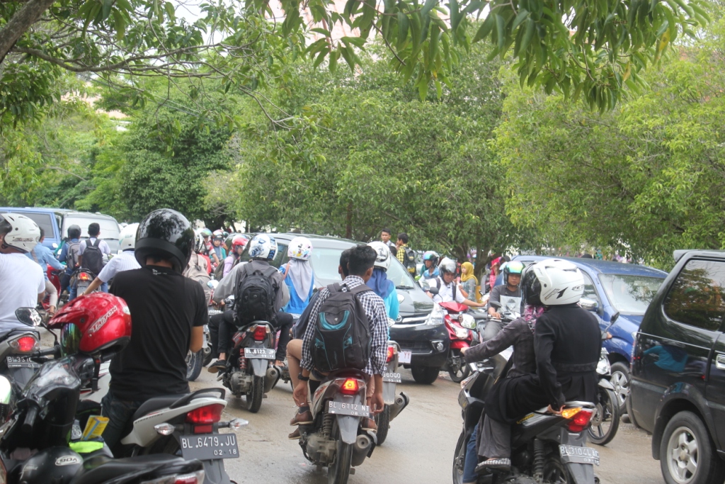 Darussalam – Pelaksanaan ujian Seleksi Bersama Masuk Perguruan Tinggi Negeri (SBNMPTN) 2013 yang bersamaan dengan pendaftaran ulang Seleksi Nasional Masuk Perguruan Tinggi Negeri (SNMPTN), Selasa, (18/06/13) mengakibatkan sepanjang ruas jalan kopelma Darussalam lumpuh selama kurang lebih 30 menit. Hal ini dikarenakan ribuan kendaraan roda dua maupun roda empat memadati kawasan tersebut.[Foto: Emi Vovo Sembiring [AM]/DETaK]