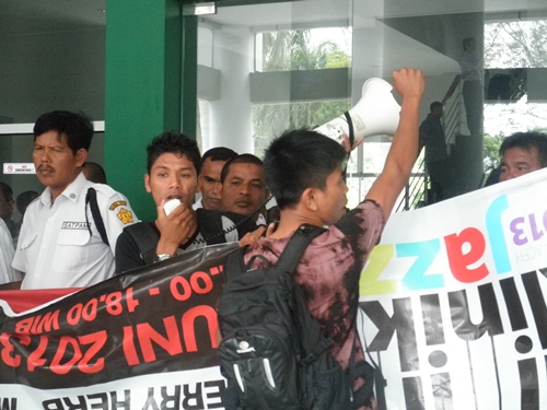 Darussalam- Belasan mahasiswa yang tergabung dalam Aliansi Mahasiswa Menggugat (AMM) Unsyiah, Jum’at (14/06/2013) kembali berunjuk rasa di depan gedung Rektorat Unsyiah. Azwar, koordinator lapangan (korlap) mengatakan, AMM menuntut kejelasan Pemilihan raya (Pemira) Unsyiah dan menuntut Forum Badan Eksekutif Mahasiswa (BEM) dibubarkan, “Karena Forum BEM di luar konstitusi mahasiswa, jelas di atur dalam konstitusi mahasiswa bahwa tidak ada namanya Forum BEM, ” katanya saat ditemui detakusk.com.