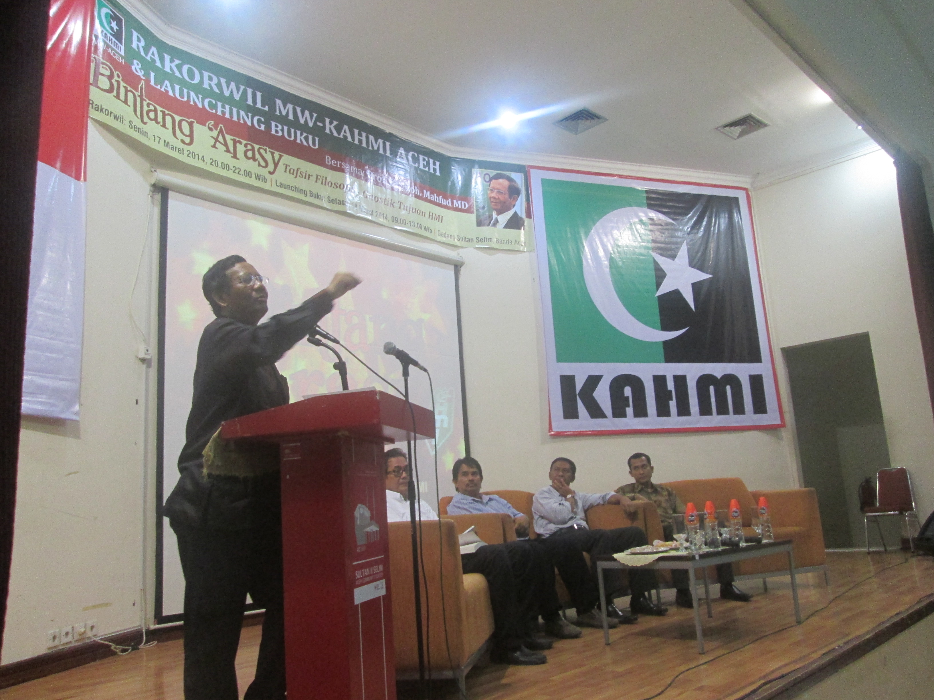 Darussalam- Mantan Ketua Mahkamah Konstitusi Mohammad Mahfud M.D mengisi acara bedah buku yang dilaksanakan oleh Korps Alumni Himpunan Mahasiswa Islam (KAHMI) di Gedung Sultan Selim pada Selasa, 18 Maret 2014.