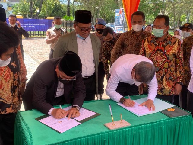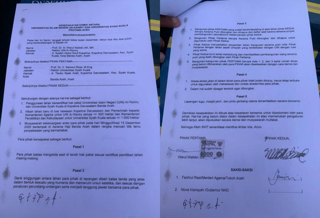 Darussalam- Universitas Syiah Kuala (USK) dan Universitas Islam Negeri (UIN) Ar-Raniry Banda Aceh secara resmi melakukan penandatanganan Kesepakatan Damai Tentang Pengalihan Status Penggunaan Barang Milik Negara (BMN) antara kedua kampus pada Rabu, 01 Desember 2021 di Lapangan Tugu Kopelma Darussalam.