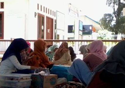 Darussalam – Mereka tengah duduk sejenak di pelataran Mushola Kid, Unsyiah, Jum’at (12/4/2013). Empat mahasiswa tersebut sejenak melepas lelah usai berjualan. Tampak tiga tingkat kotak persegi panjang berisi kue donat, bersebelahan dengan sekotak air mineral.