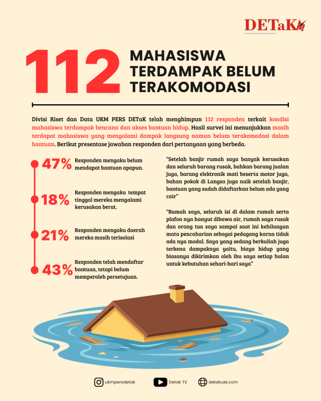 Darussalam – Unit Kegiatan Mahasiswa (UKM) Pers DETaK Universitas Syiah Kuala (USK) melalui Divisi Riset dan Data menghimpun sebanyak 112 responden terkait kondisi mahasiswa terdampak bencana dan akses terhadap bantuan hidup. Survei ini dilakukan untuk mengetahui kondisi mahasiswa yang mengalami dampak langsung serta sejauh mana bantuan telah diterima.