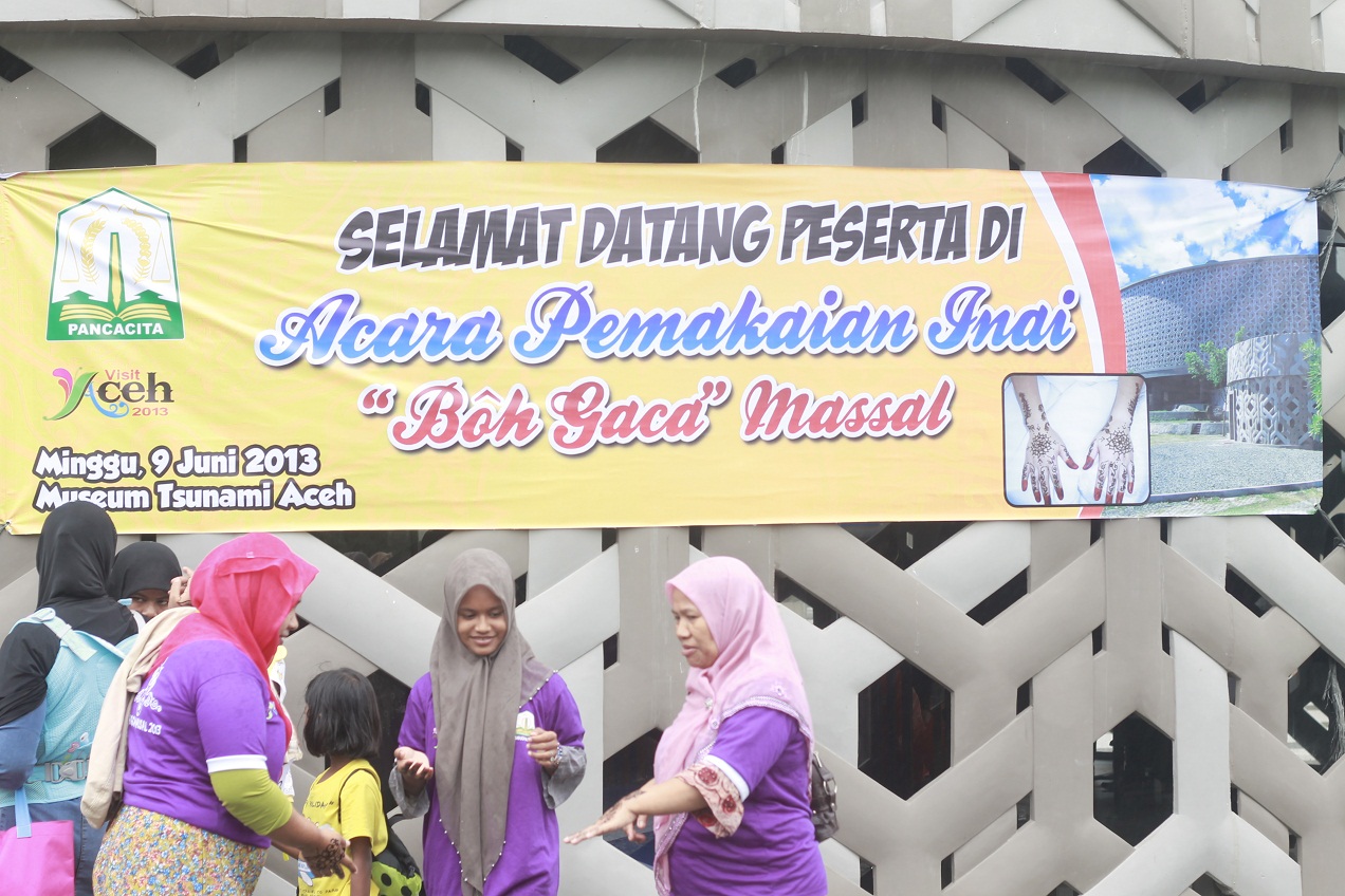 Banda Aceh- Seribuan peserta memadati halaman Museum Tsunami Aceh, Minggu,(09/06/2013). Dinas Kebudayaan dan Pariwisata (Disbudpar) Provinsi Aceh menyelenggarakan Pemakaian inai massal atau “boh gaca” massal. Untuk pemecahan rekor yang di catat di Museum Rekor Indonesia (MURI).