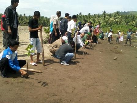Aceh Besar- Pulusan mahasiswa yang tergabung dalam  aksi relawan Sobat Bumi Aceh, Kamis (20/06/2013)  ikut berpartisipasi dalam  rehabilitasi dan pembinaan kelompok nelayan di Kampung Ruyung, kecamatan Mesjid Raya, Aceh Besar. Kegiatan tersebut berupa penanaman 1000 manggrove di area kampung Ruyung.