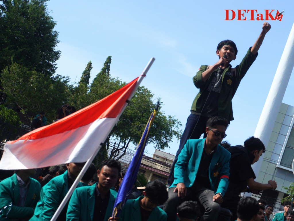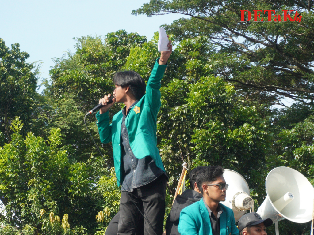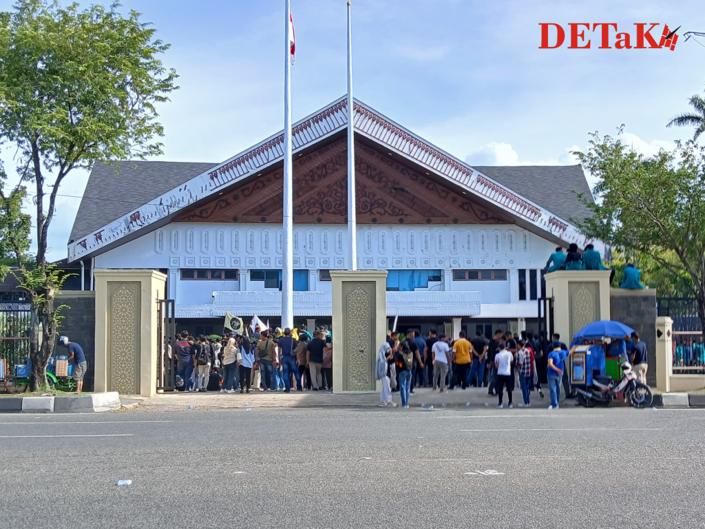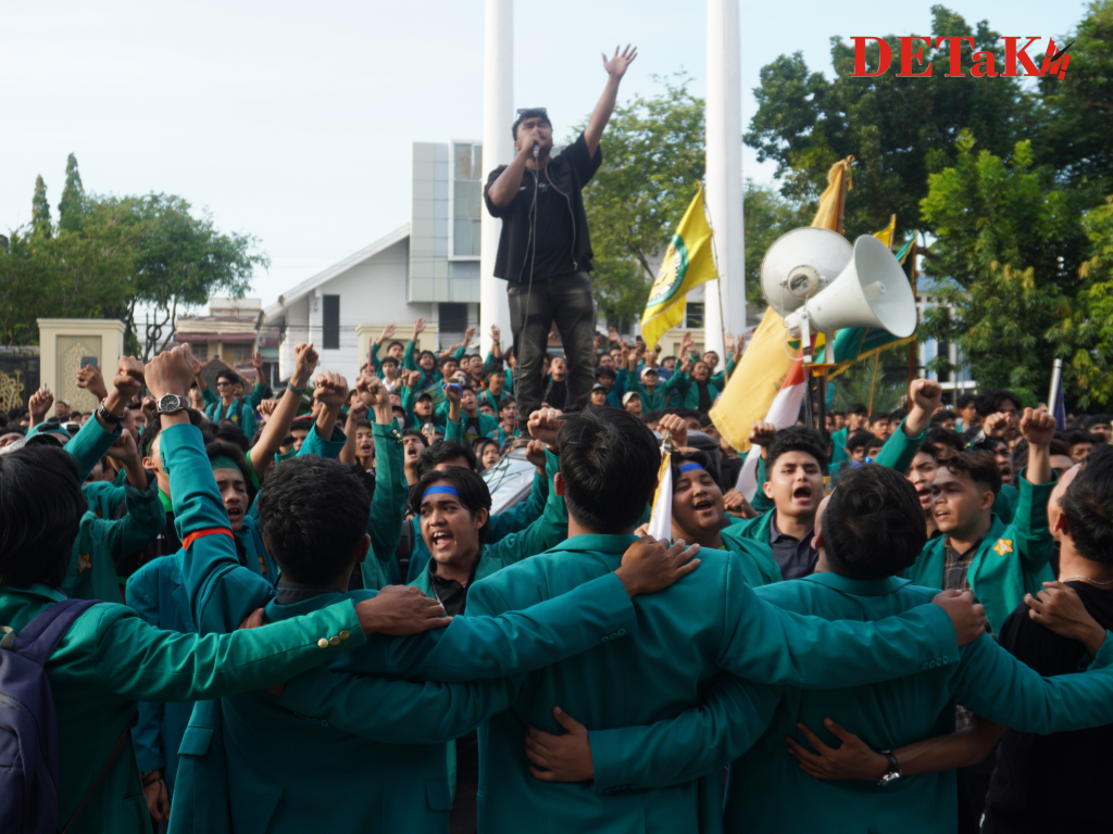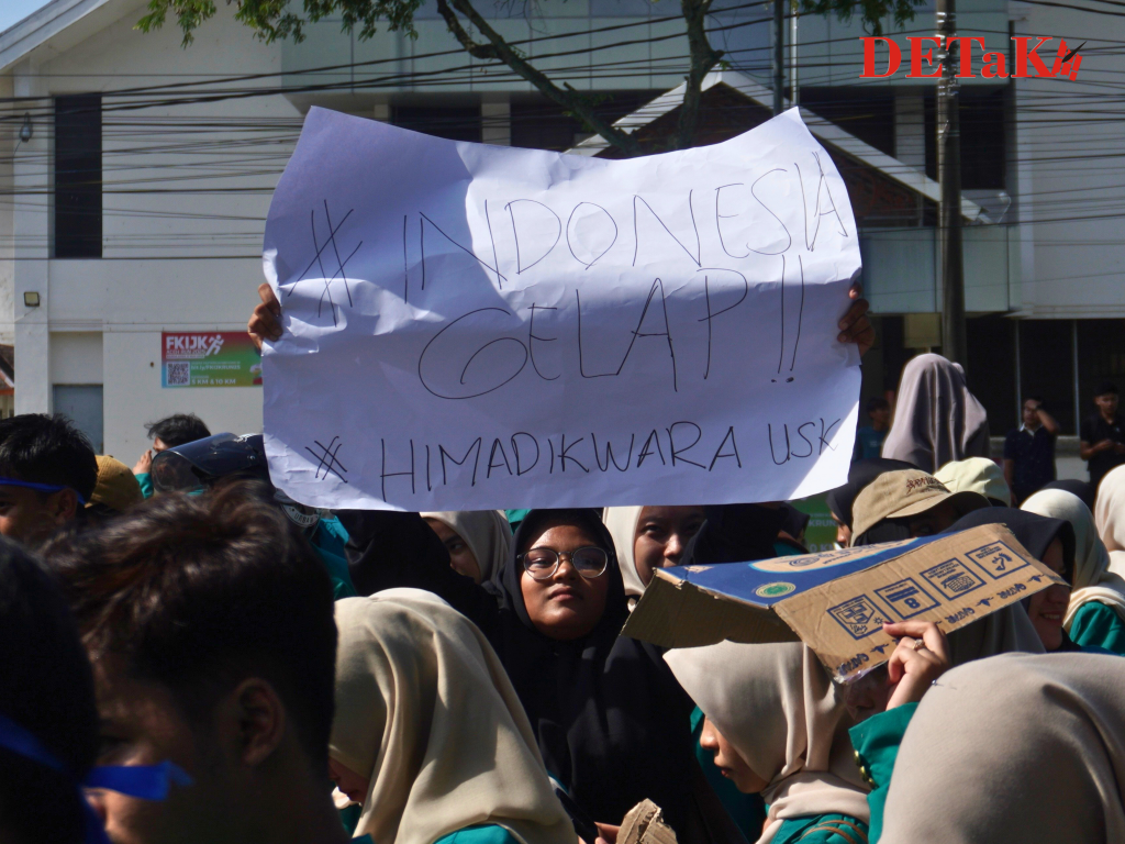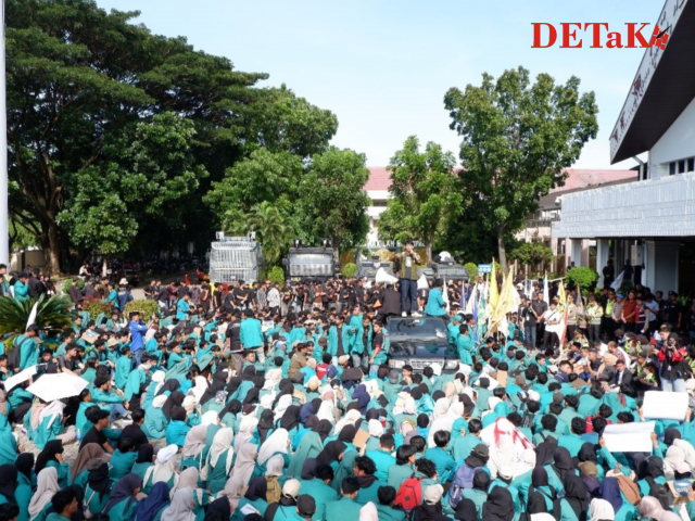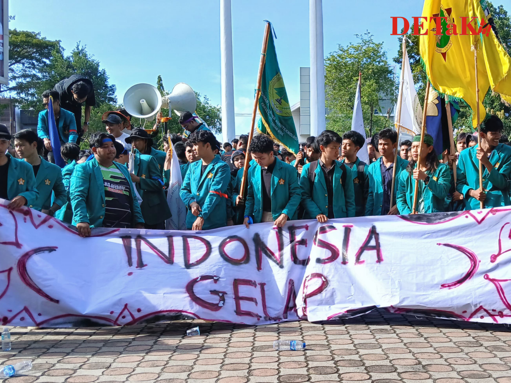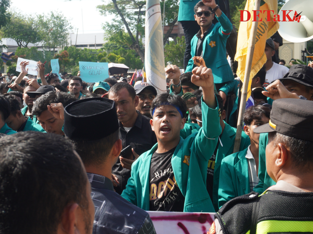 Darussalam-Potret sejumlah mahasiswa Universitas Syiah Kuala (USK) yang tengah menggelar aksi demo bertajuk ‘Indonesia Gelap’ di depan gedung Dewan Perwakilan Rakyat Aceh (DPRA) pada Rabu, 19 Februari 2025.