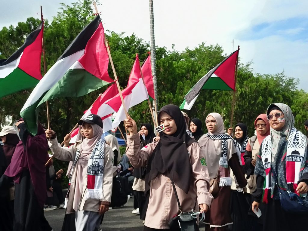 Massa aksi di kalangan perempuan mengibarkan bendera Palestina dan Indonesia sebagai bentuk dukungan kemanusiaan. 12/10/2025. (M. Azkal Azkiya [AM]/DETaK)