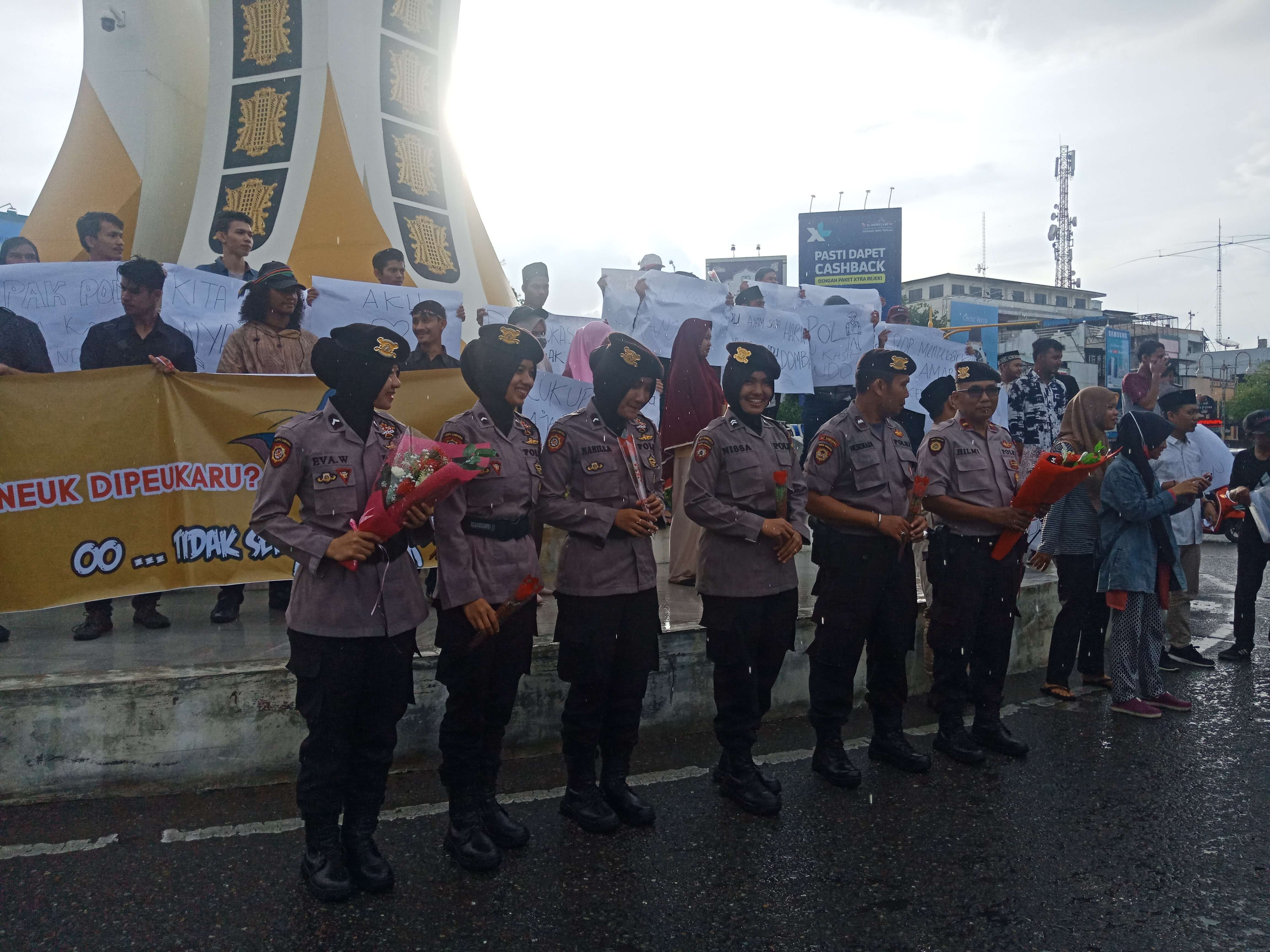 Aksi damai ditutup dengan pemberian bunga kepada polisi dan polwan sebagai simbol terima kasih masyarakat kepada polisi sebagai penegak hukum serta doa bersama oleh santri. []