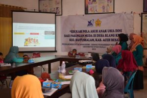 Darussalam – Tim Mahasiswa Program Kreativitas Mahasiswa Bidang Pengabdian Masyarakat (PKM-M) yang terdiri dari lima orang mahasiswa jurusan Pendidikan Guru Anak Usia Dini (PG-AUD) Fakultas Keguruan dan Ilmu Pendidikan (FKIP) Universitas Syiah Kuala (Unsyiah) telah melakukan kegiatan pengabdian masyarakat. Bentuk kegiatan yang dilakukan yaitu berupa pemberian layanan edukasi pola asuh anak usia dini bagi pasangan muda di Desa Blang Krueng, Kec. Baitussalam, Kab. Aceh Besar pada hari Rabu, 4 Juli 2018.