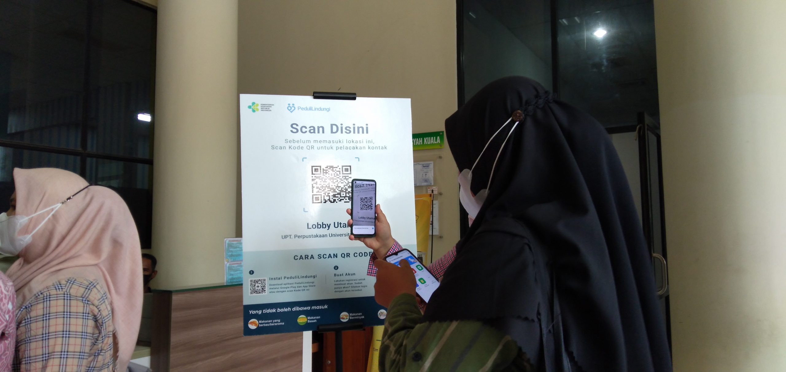 Pada poster Instagram di akun resmi Perpustakaan USK hanya tertera syarat untuk mengunjungi perpustakaan dengan mendaftar di link yang sudah tertera, melakukan vaksinasi dan check in dengan aplikasi peduli lindungi di pintu masuk perpustakaan.