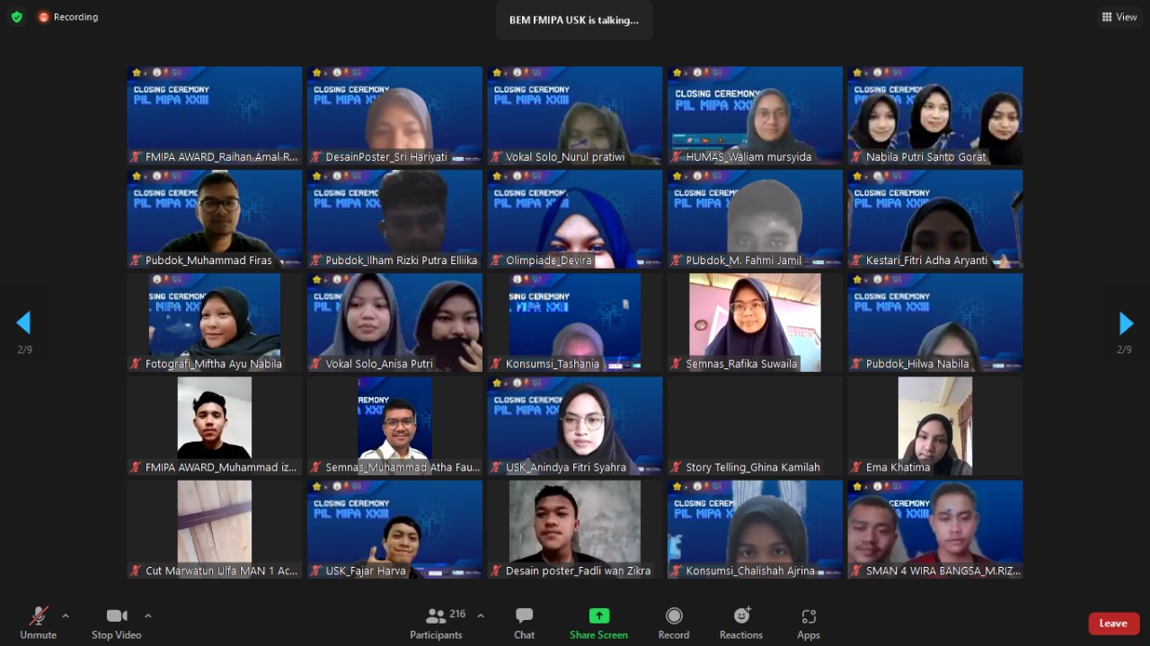 Darussalam – Badan Eksekutif Mahasiswa (BEM) Fakultas Matematika dan Ilmu Pengatahuan Alam (FMIPA) Universitas Syiah Kuala mengadakan Closing Ceremony sebagai bentuk kegiatan penutupan acara PIL MIPA XXIII 2021. Kegiatan yang mengangkat tema “Ekspresikan Jiwa Integrasi, Intelektual dan Kreativitas Saintis Muda Berdaya Saing Tinggi yang Kompetitif” ini resmi ditutup pada Minggu, 24 Oktober 2021 melalui aplikasi Zoom Meeting.