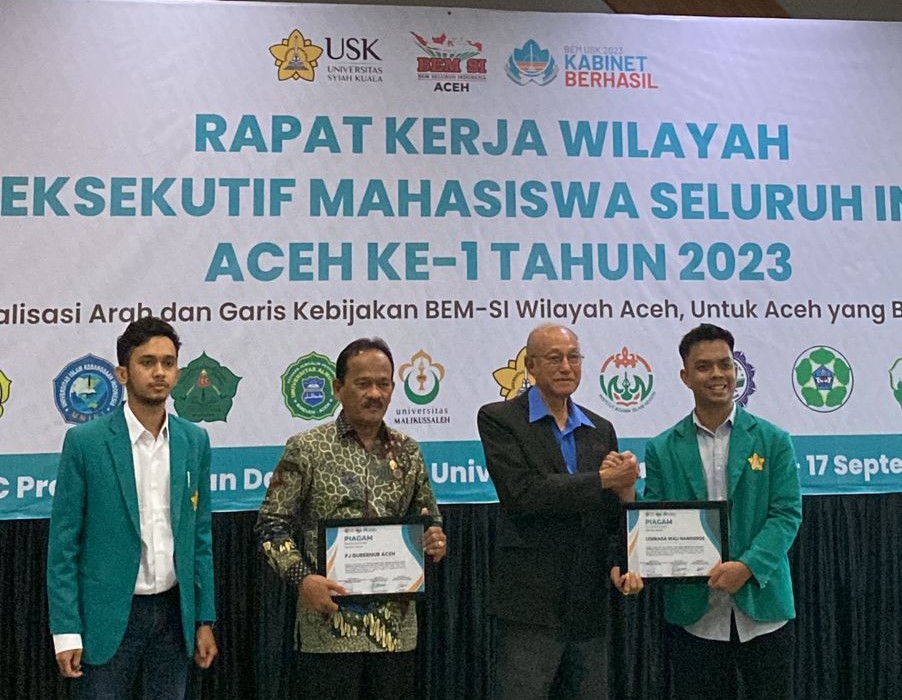 Darussalam- Badan Eksekutif Mahasiswa Seluruh Indonesia (BEM SI) Wilayah Aceh menggelar Rapat Kerja Wilayah (Rakerwil) pertamanya di Universitas Syiah Kuala (USK), Banda Aceh, pada 15 s.d. 17 September 2023. Kegiatan ini mengusung tema “Optimalisasi Arah dan Garis Kebijakan BEM-SI Wilayah Aceh yang Berdaulat.” Kegiatan ini dihadiri oleh PJ Gubernur Aceh yang diwakili oleh asisten 2 dan Wali Nanggroe Aceh. Selain itu, ada 10 universitas yang tergabung dalam aliansi BEM SI Wilayah Aceh yang turut menghadiri kegiatan tersebut, yakni STAIN Meulaboh, USK, Poltekkes Kemenkes Aceh, STIT Syekh Saman Al Hasan Gayo Lues, IAIN Takengon, Universitas Al-Muslim, Uniki Lhokseumawe, IAIN Lhokseumawe, Universitas Samudera (Unsam), dan Universitas Malikussaleh.