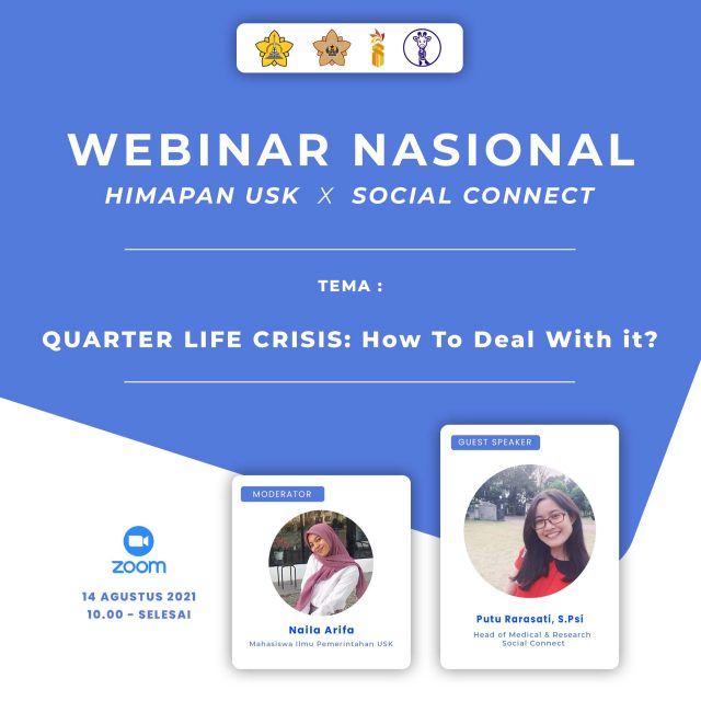 Darussalam- Himpunan Mahasiswa Ilmu Pemerintahan Universitas Syiah Kuala (Himapan USK), berkolaborasi dengan Social Connect mengadakan webinar nasional pada Sabtu, 14 Agustus 2021 melalui Zoom Meeting. Webinar kali ini mengangkat tema “Quarter Life Crisis: How To Deal With It?” dan dihadiri sekitar 140 orang yang terbuka untuk umum.