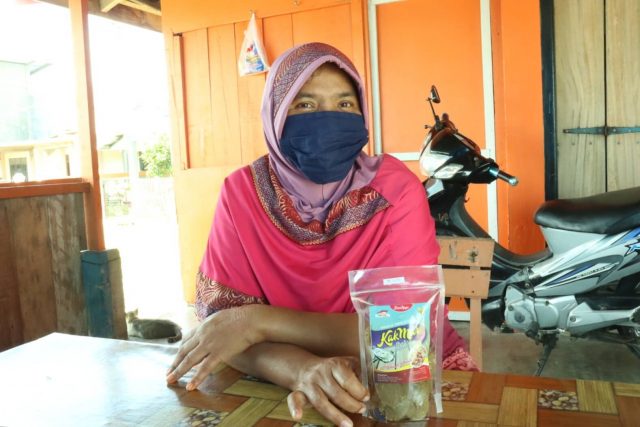 Ibu Mariati bersama kerupuk olahan tiram yang dijualnya. 21/08/2021. (Febby Andriyani/DETaK)