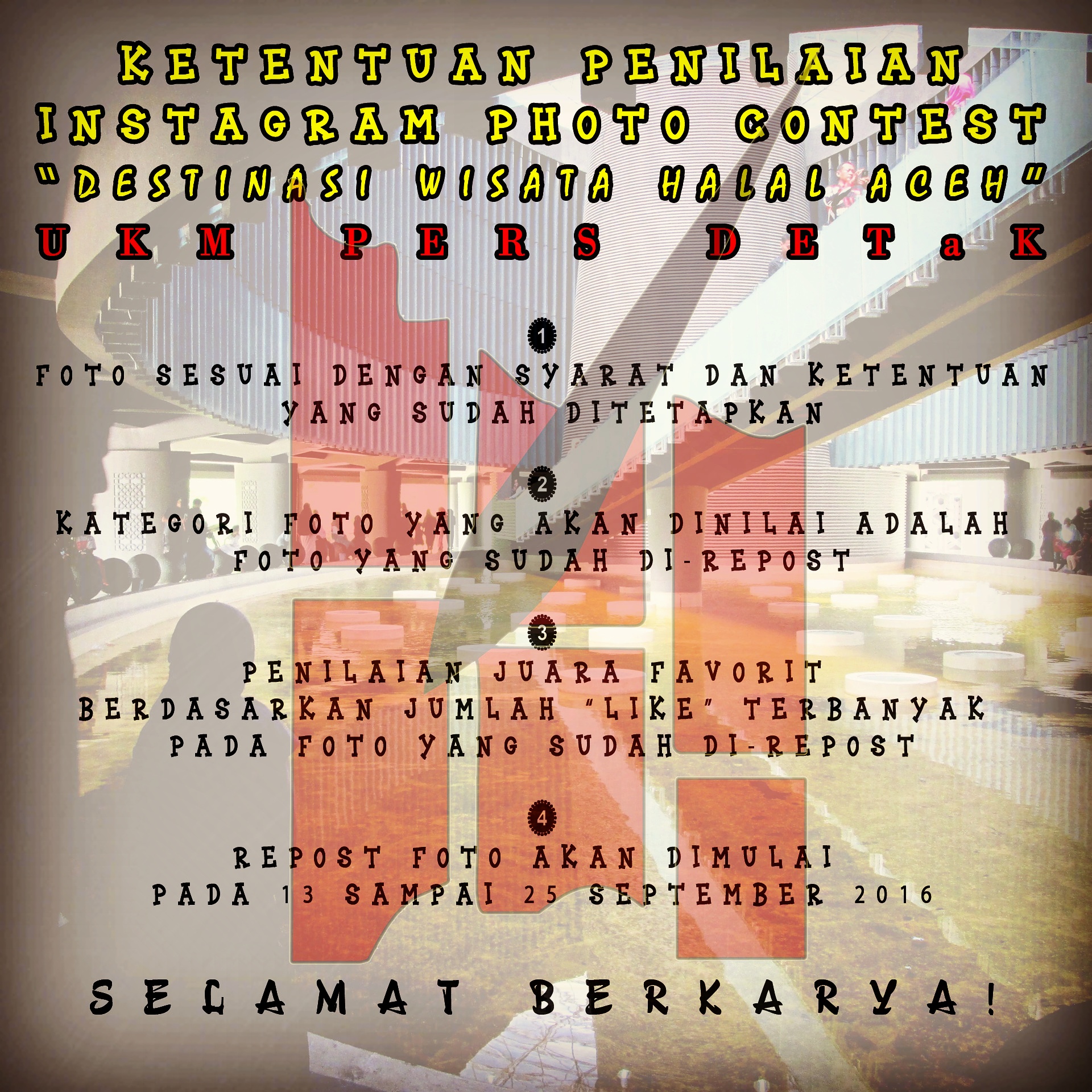 Unit Kegiatan Mahasiswa (UKM) Pers DETaK Unsyiah bekerjasama dengan Dinas Kebudayaan dan Pariwisata Aceh mengadakan lomba Instagram untuk umum dengan tema “DESTINASI WISATA HALAL ACEH”. Untuk mengikuti lomba ini pastikan Anda memenuhi syarat dan ketentuan di bawah ini. Selamat Berpartisipasi!